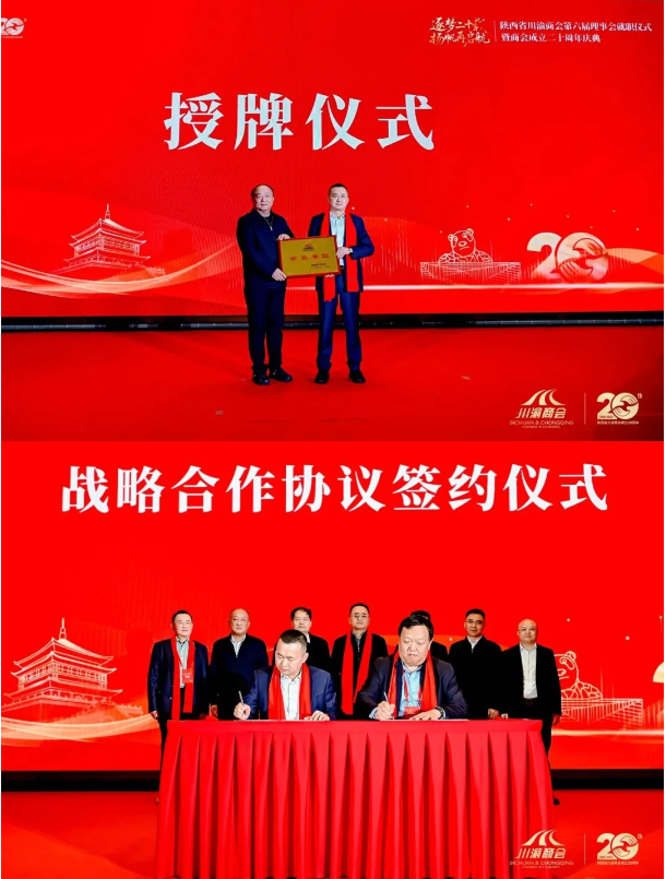 大会回顾了陕西省川渝商会20年发展历程,完成新老会长交接,第六届会长杜云钦作就职发言并规划发展蓝图。陕川渝三地相关领导及川商总会、秦商总会负责人分别致辞,对商会发展给予肯定并寄予厚望。现场还举行了理事会授牌、先进个人表彰仪式,陕西省川渝商会与22家在陕川渝籍商会及多家跨区域机构签订合作协议,深化协同发展。文艺表演与互动抽奖环节穿插其间,现场氛围热烈融洽。