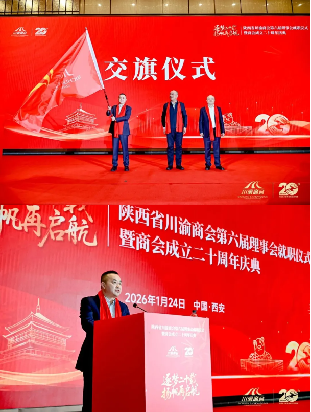 2026年1月24日,陕西省川渝商会第六届理事会就职仪式暨成立20周年庆典在陕西圆满举行。河南省川渝商会会长薛荣、执行秘书长戚太明受邀参会,与陕川渝三地相关领导、全国100余家川渝籍商会代表及各界嘉宾共500余人齐聚一堂,共襄盛举。