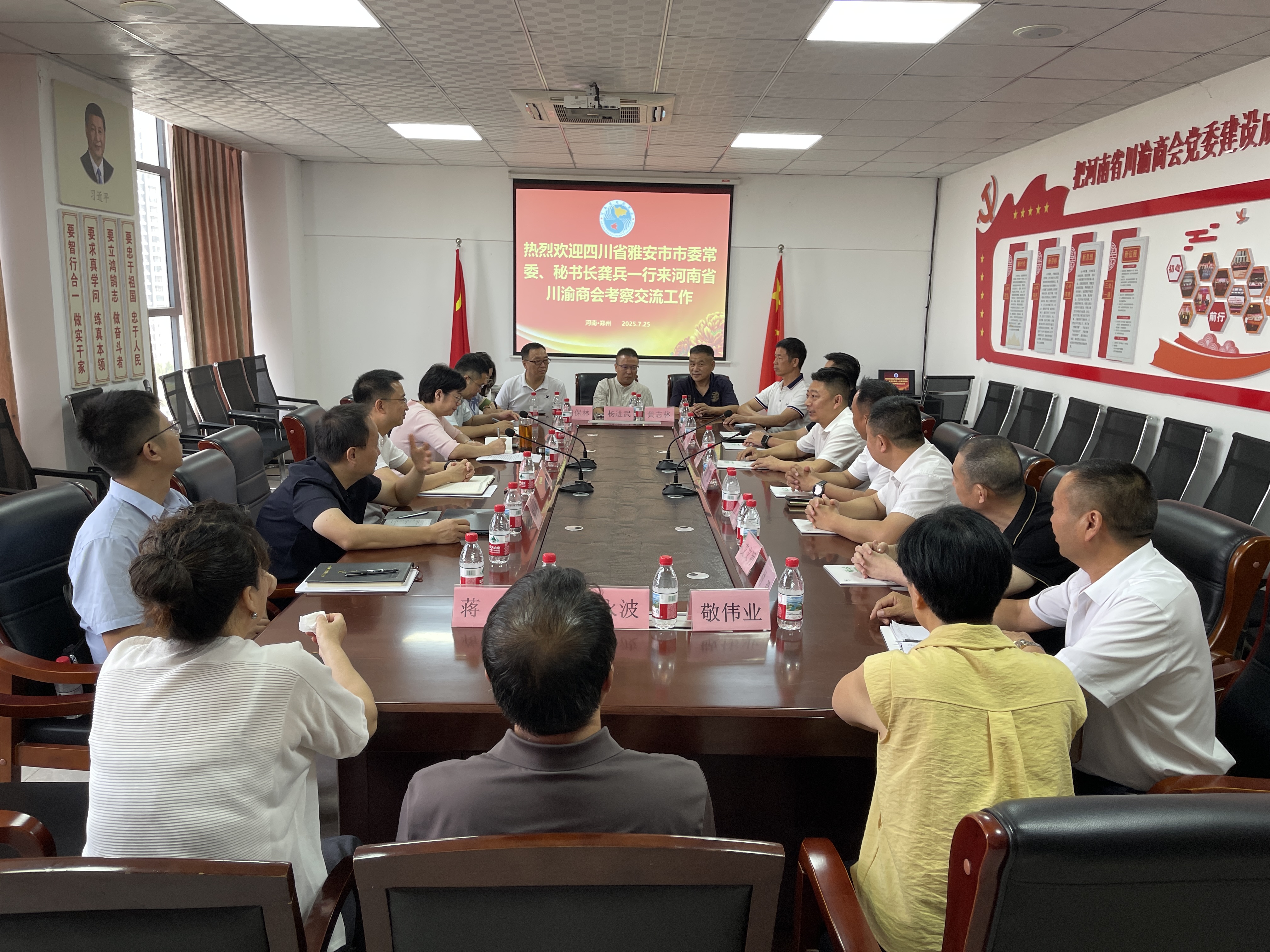 2025年7月25日,四川省雅安市委常委、秘书长,雅安经开区党工委书记龚兵率考察团一行七人莅临河南省川渝商会考察交流,并专程看望在豫雅安籍企业代表。雅安市经济合作和外事局局长常大瑞,雅安经开区党工委委员、管委会主任喻思皓及经开区经合局主要负责人一同到访。河南省川渝商会常务副会长、秘书长沈仕伟,常务副会长何勇、李龙、嘉俊,副会长张杰、胡晓宏、艾文明,常务副秘书长付强,副秘书长丁乐及多位在豫雅安籍企业代表热情接待并参与活动。