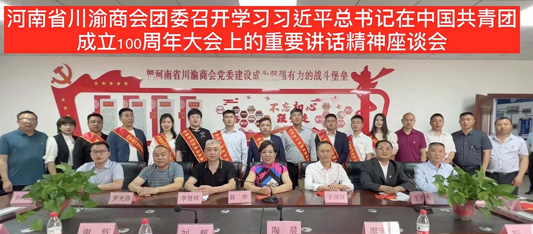 2022年5月22日,河南省川渝商会团委在河南郑州召开了学习习近平总书记在中国共产主义青年团成立100周年大会上的重要讲话精神座谈会。党的十九大代表、河南省川渝商会党委第一书记、会长薛荣,河南团省委部长于深深,河南省川渝商会执行会长陈海,川渝商会党委委员、执行会长罗光强,河南省川渝商会流动党员党委委员、常务副会长兼秘书长沈仕伟,常务副会长廖宏奇、李凤远,副会长刘辉、谢辉、杨富友、唐军,河南省川渝商会团委领导班子成员和常务理事靳美美、肖锐、何勇、何蓉、侯雨希、陶晨、孙德钊、张富林、张飞,以及河南省川渝商会名誉会长李贤祥,重庆团市委驻河南工委首任书记黄世友,川渝商会钢筋工协会会长罗军峰,河南省外地驻豫经贸协会外联部长王岩峰,中国国际新闻社董事长向瑞成,川渝商会常务副秘书长付强,副秘书长、党委办公室主任丁乐和党、团员代表共40余人参加了本次座谈会。河南省川渝商会党委书记、名誉秘书长王开凡主持了本次座谈会。